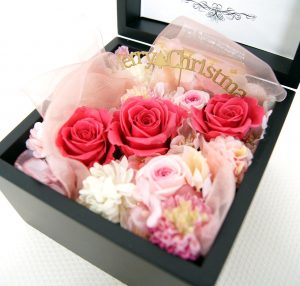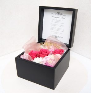 蓋付きのボックス型アレンジです。蓋の内側(外側も可)にメッセージやお写真が入れられます。ピンクのバラをメインにロマンティックに仕上げました。